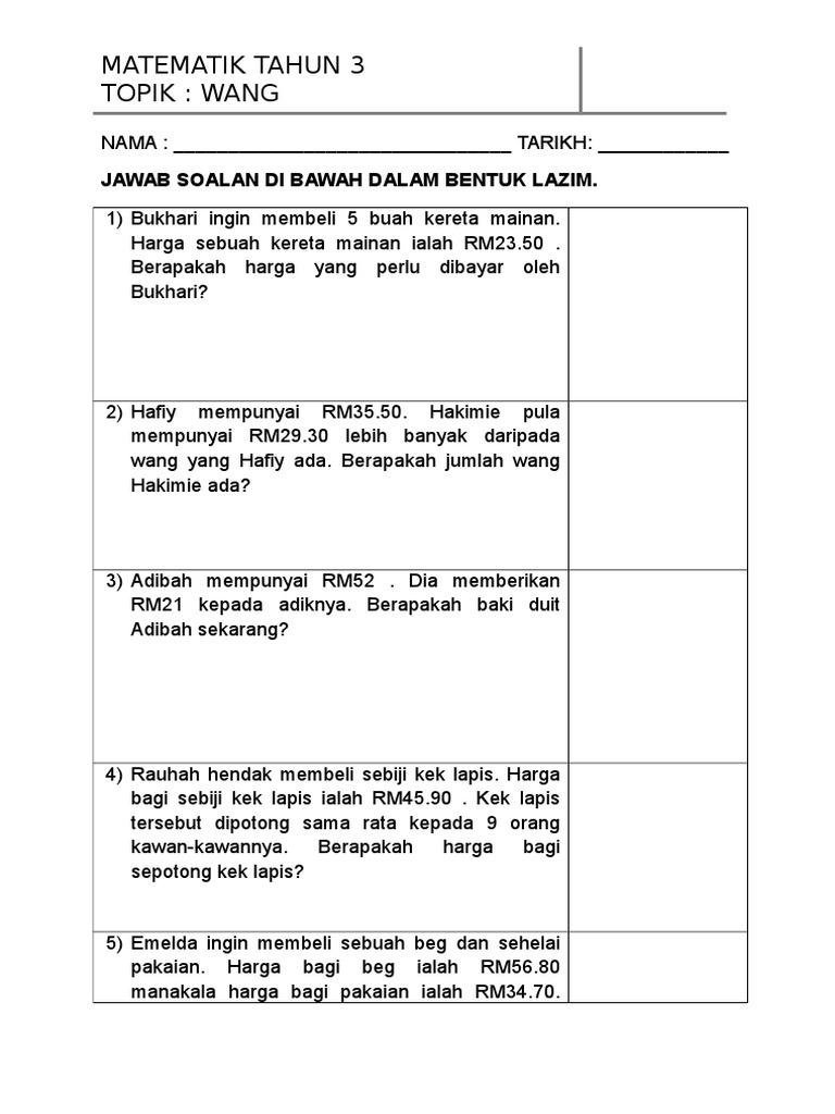 Mengendalikan operasi asas melibatkan mata wang malaysia a. Matematik Tahun 3 Tajuk. Ibubapa mengedarkan lembaran kerja 6 dan 7.